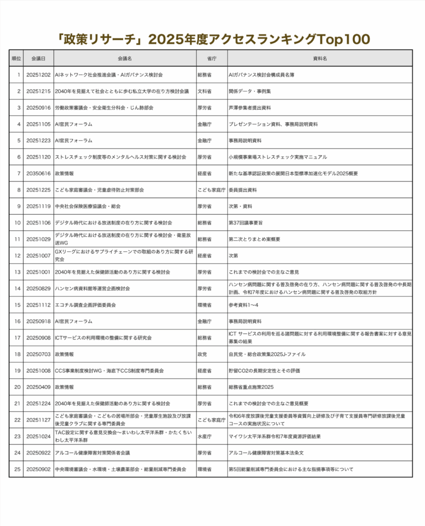 2026年1月8日 2025年アクセスランキングTOP100 ツイート みらい研DBシステム(政策リサーチ)の2025年のアクセスランキングです。画像をクリックすると上位100位まで表示されます。 « 前の記事へ │トップページ│